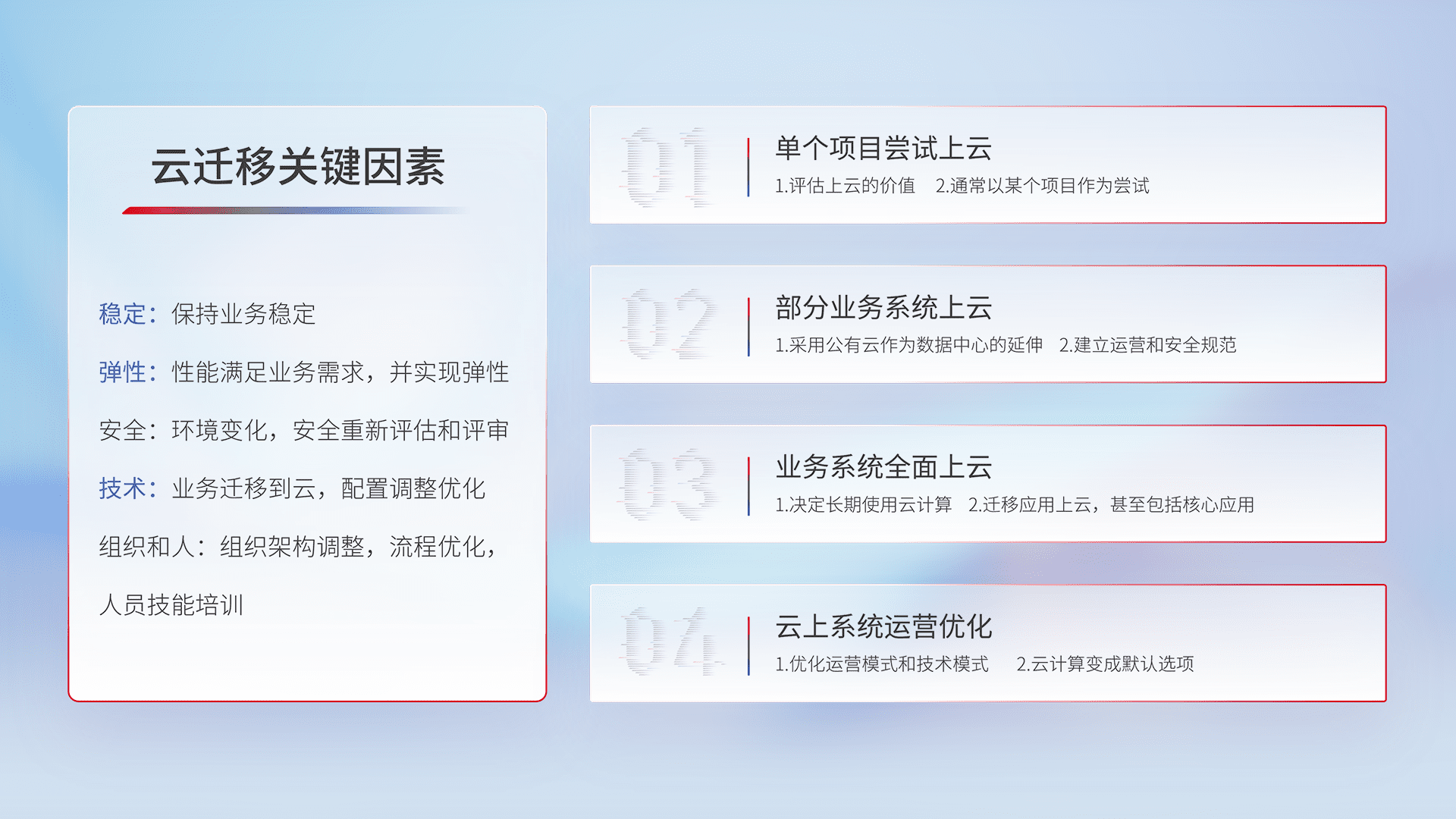 结合实际业务,,,,从规划设计、、、云平台选型、、、云原生改造、、、数据迁移、、、集成交付,,,,迁移全过程为客户识别最佳上云路径,,,,做好风险识别管理,,,,设计网络架构、、、、身份权限、、、、安全审计合规、、、操作审计、、日志审计、、、监控告警策略、、多站点容灾设计等,,,,对云上基础设施进行整体规划,,,提升IT治理水平,,以满足弹性、、高可用、、、高性能的需求。。。